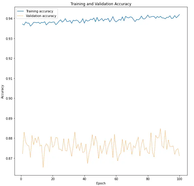 With two hidden layers (16, 8) and an output layer with a sigmoid activation function, we created neural networks using Keras. We used relu for the hidden layer’s activation function, the Adam optimizer for loss, and binary cross entropy loss for loss. We ran the model for 100 epochs and observed that the training accuracy and validation accuracy were almost at constant values.