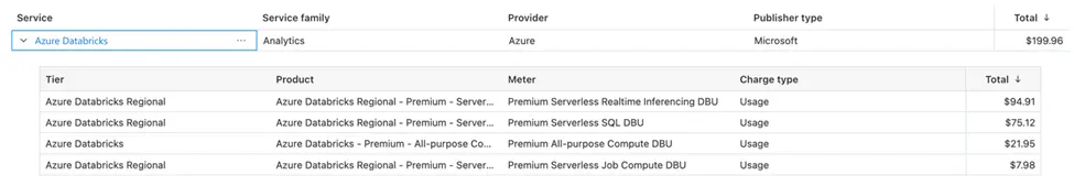 The image below shows a \$199.96 expense for Azure Databricks, including serverless data analytics, SQL processing, and job computation, priced by resource usage intensity. These costs reflect the scalable consumption of Azure’s cloud computing services for project development.